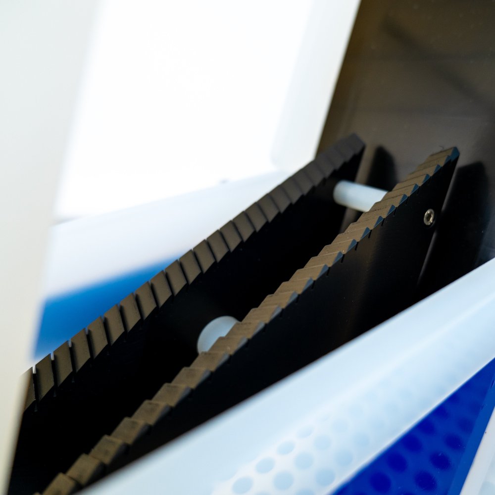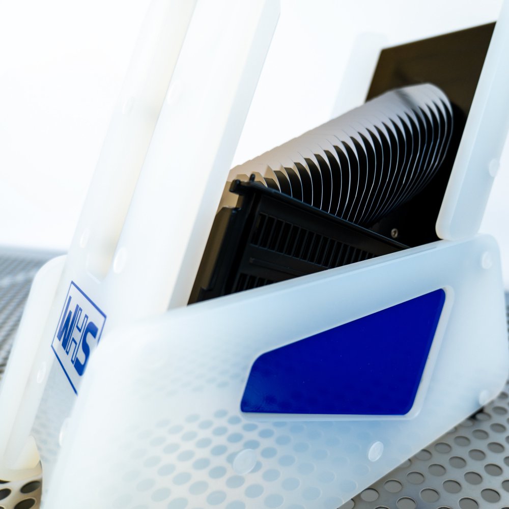 Operators use the WHS-P2 by lowering a wafer cassette with wafers onto the tool. The ergonomic angle and built-in guides make this process easy and repeatable, ensuring precise positioning every time. The unique comb design provides protection against wafer edge chipping, further enhancing wafer safety. The escalator raises each wafer 0.200" (5mm) above the previous one, allowing operators to quickly and efficiently verify the entire wafer lot.