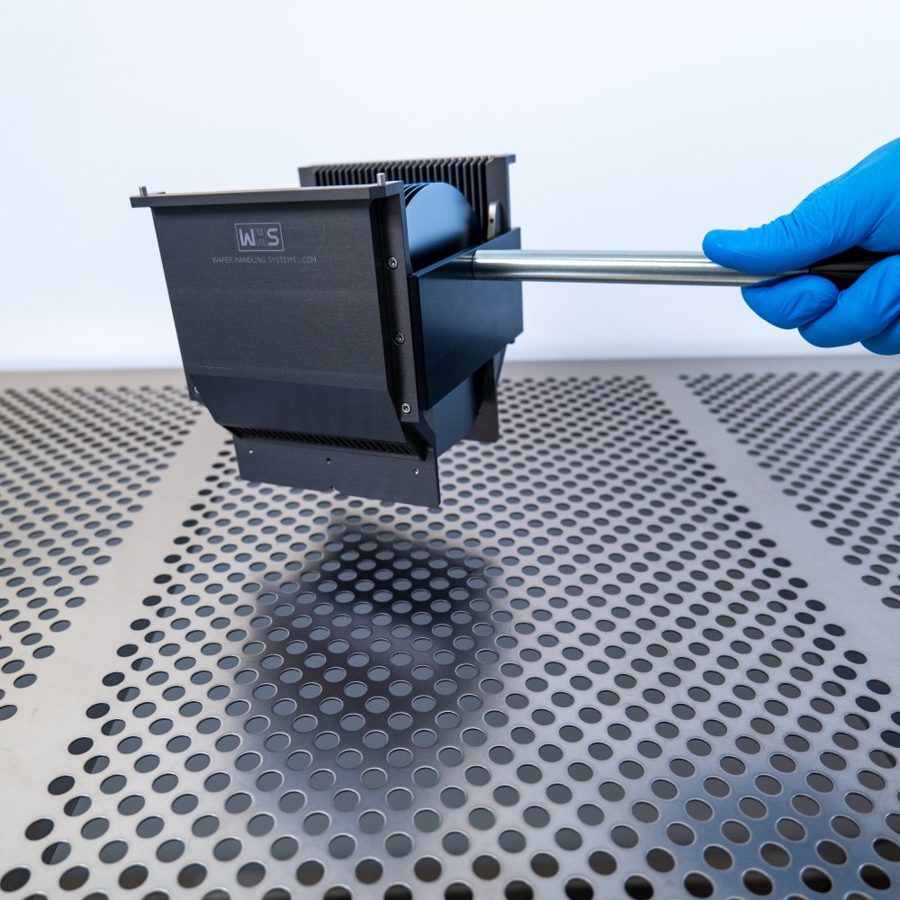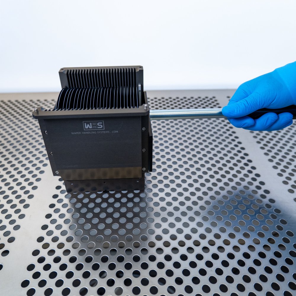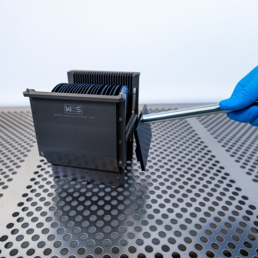 WHS - Wafer Handling Systems has developed an advanced detachable cassette handle specifically for the 6 inch WHS-M1 style aluminum cassettes with H-bar, enhancing operator safety and efficiency in high-temperature environments like ovens and process chambers. Designed for use on operator workstations or cool down acclimation work surfaces immediately post-bake, this handle can safely manage hot cassettes in a wafer vertical position. This handle features ergonomic plastic pistol grips, providing a convenient and secure method for handling aluminum process cassettes. The stainless-steel plate includes an interface channel, ensuring a secure connection with the cassette to prevent accidental drops. Constructed from advanced cleanroom materials, engineered to withstand thermal heat and minimize particle shedding.
